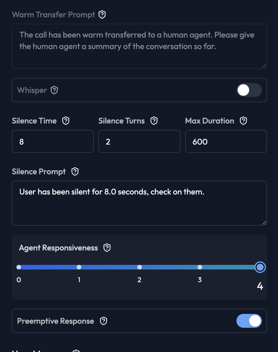 Maximum call length in seconds (default: 600 = 10 minutes). Recommended: 300-600 seconds for most use casesSilence Prompt