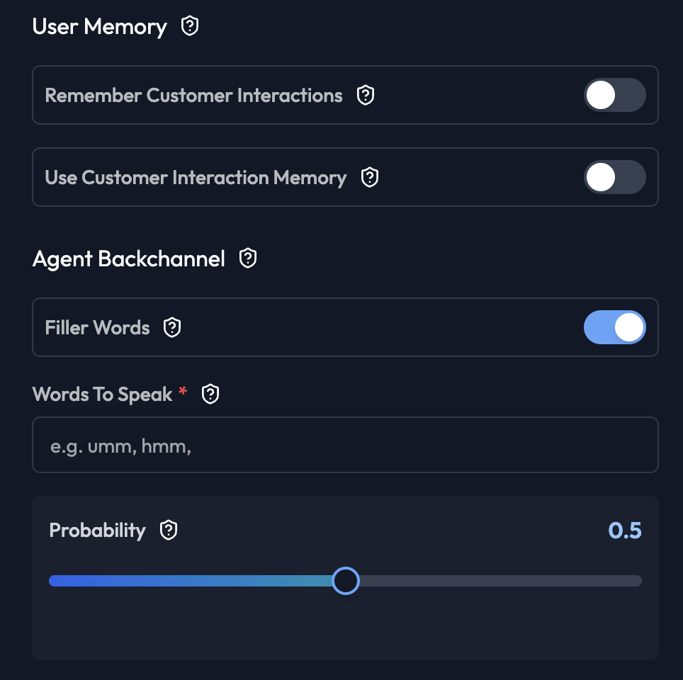 Filler Words Agent says acknowledgment sounds during customer speech.- Enabled: “mm-hmm”, “yes”, “I see”