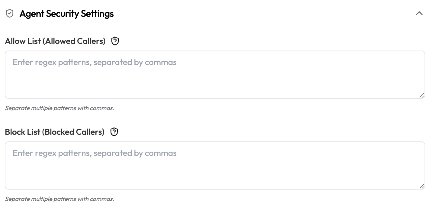 | Allow List (Allowed Callers) | Text area | Empty | Regex patterns for sources allowed to trigger this agent, separated by commas. Leave empty to allow all. |