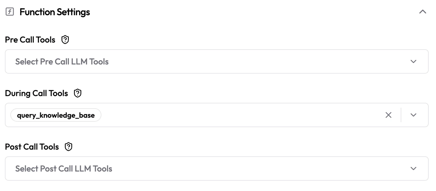 | Post Call Tools | Multi-select | Empty | LLM tools that run after the task completes (e.g. store results, notify another system). |