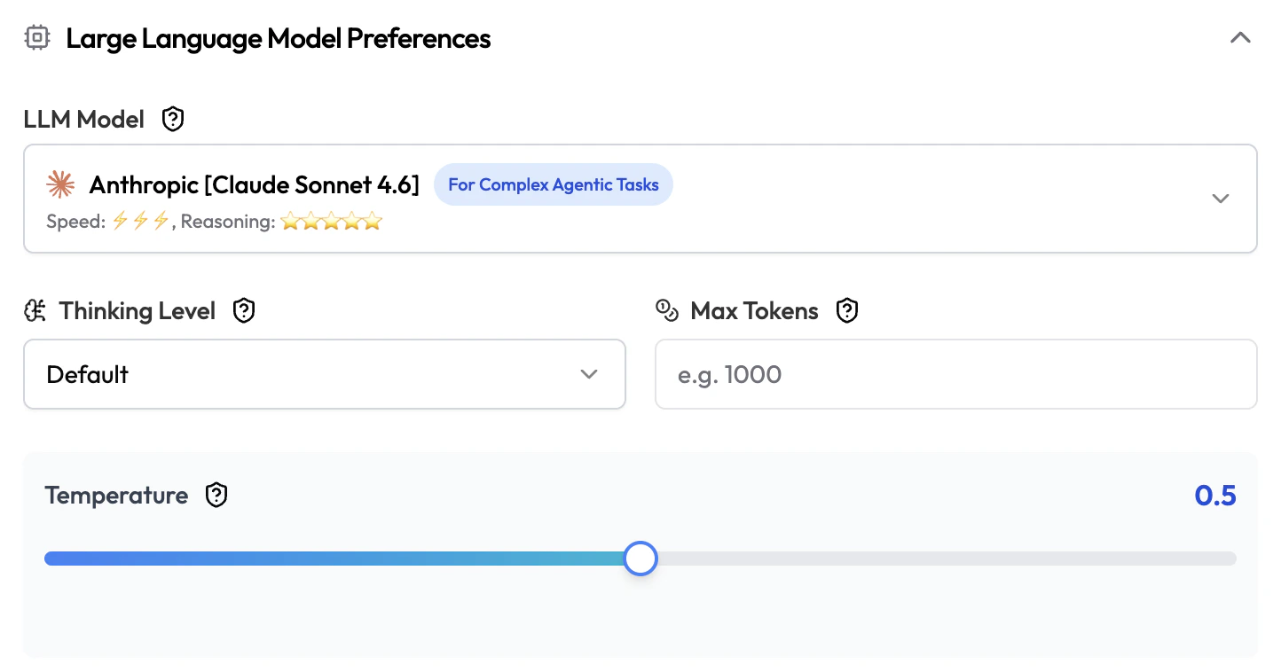 | Temperature | Slider | 0.5 | Response creativity. For structured tasks (classification, extraction) use 0.0–0.3. For generative tasks (drafting, summarizing) use 0.5–0.8. |