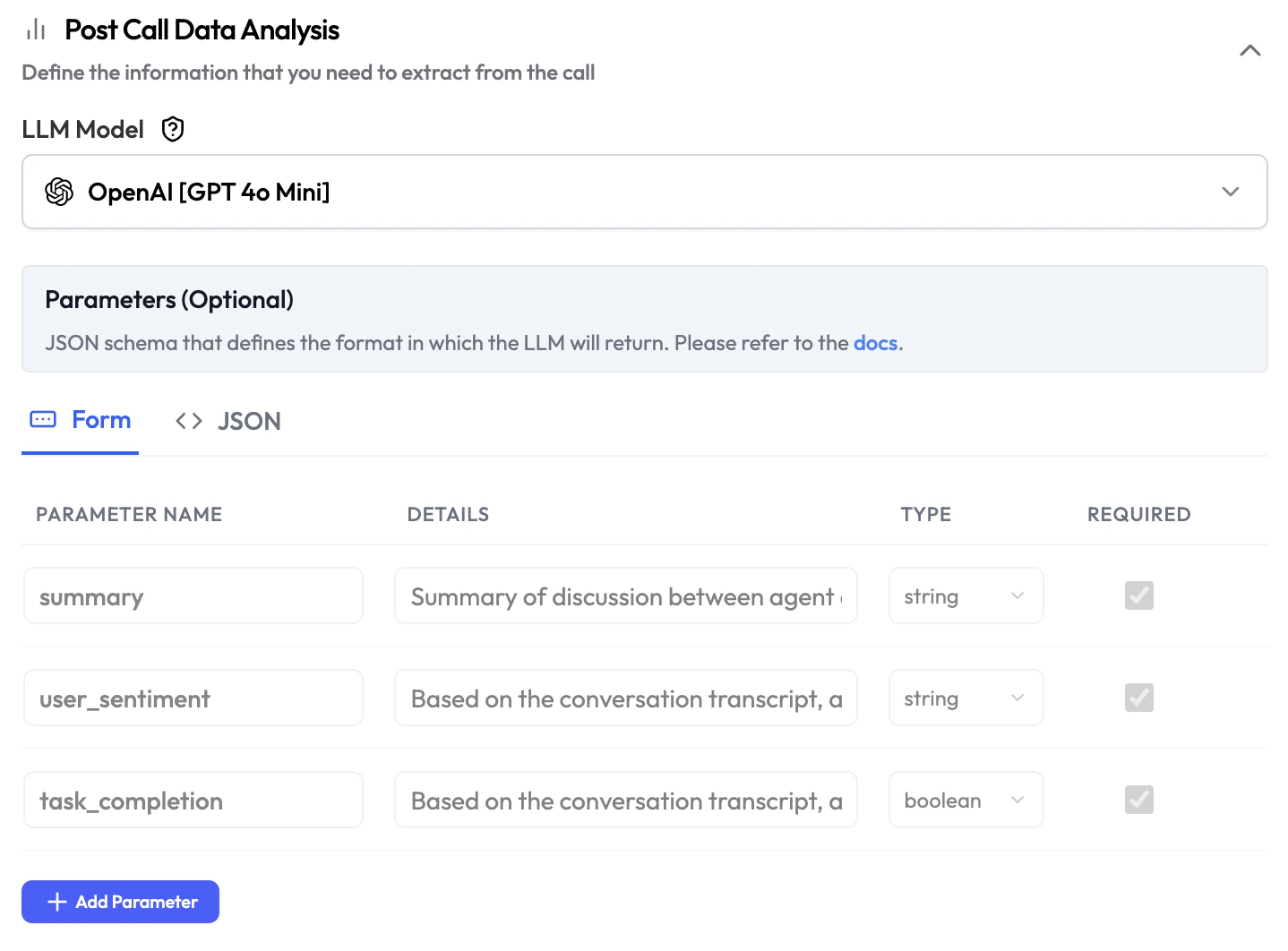 | Parameters | Form / JSON | Define the data points to extract from each execution. Switch between Form (add parameters one by one) and JSON (paste a raw JSON schema). |