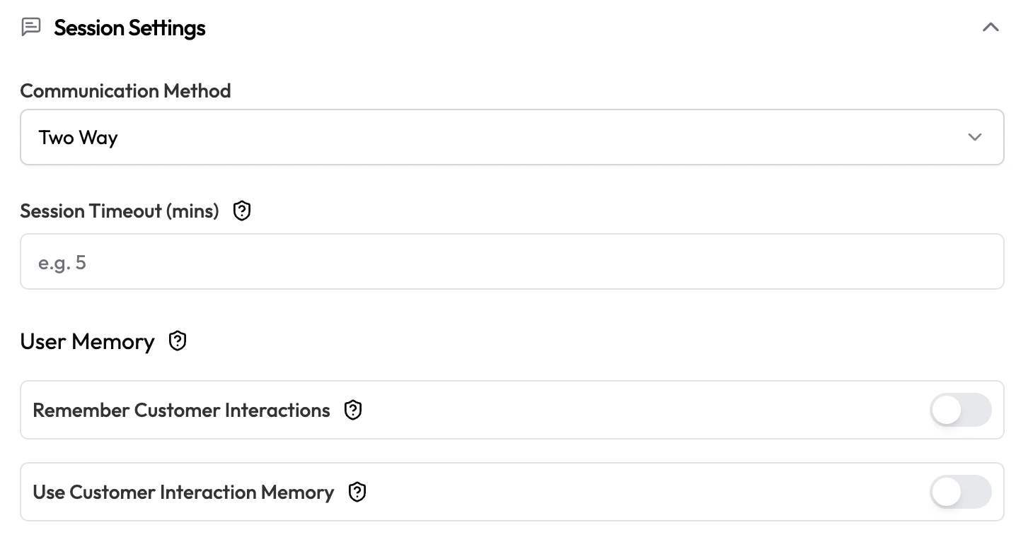 | Use Customer Interaction Memory | Toggle | Off | Pull past execution summaries into context when this agent is triggered again for the same user or entity. |