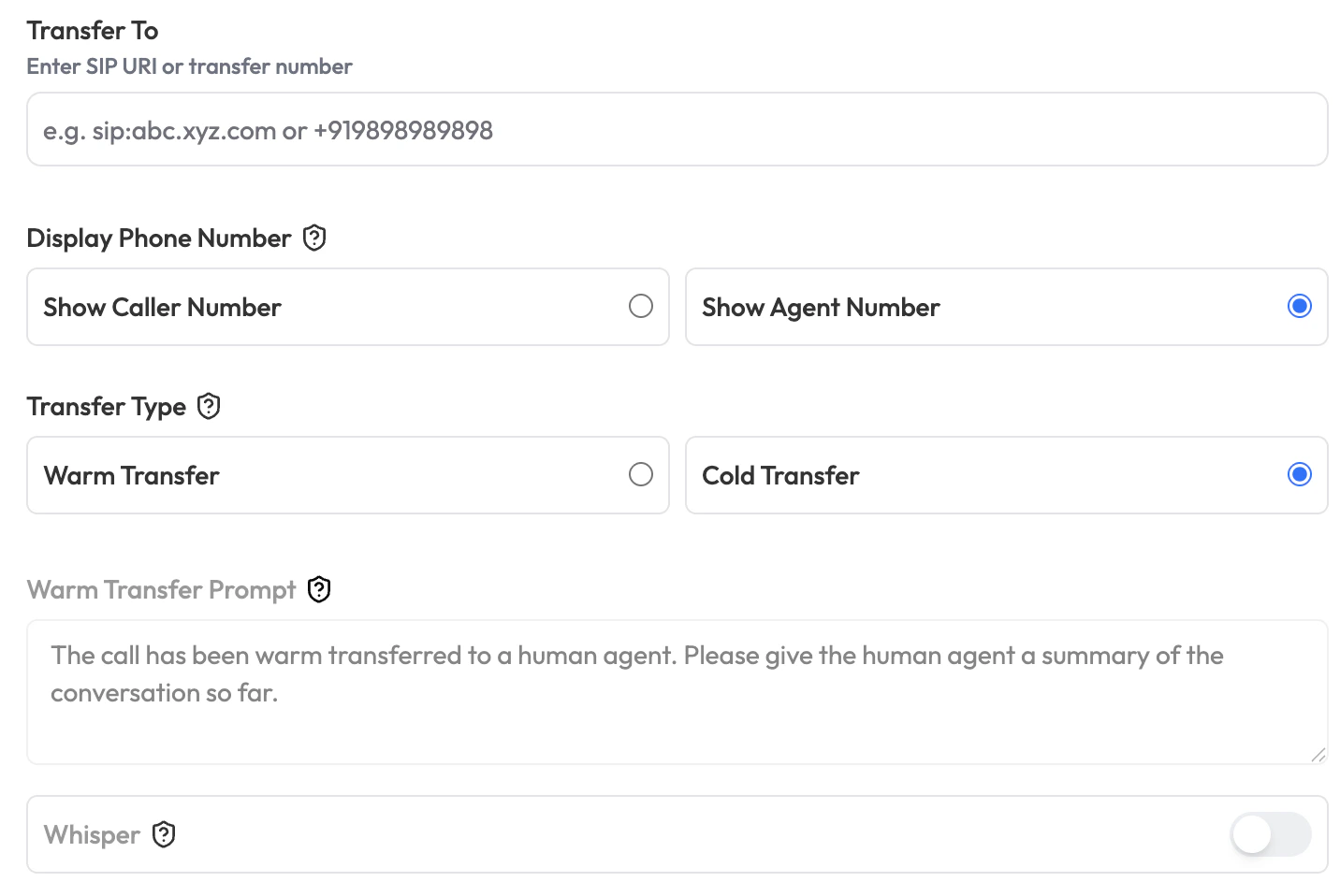 | Warm Transfer Prompt | Text | "" | The message the agent reads during a warm transfer (e.g. “I have a customer calling about a billing issue”). Only applies when Transfer Type is Warm Transfer. |