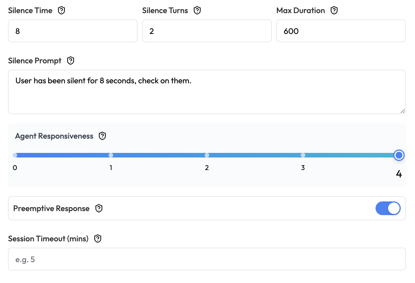 | Silence Prompt | Text | "" | What the agent says when a silence timeout occurs (e.g. “Are you still there?”). |