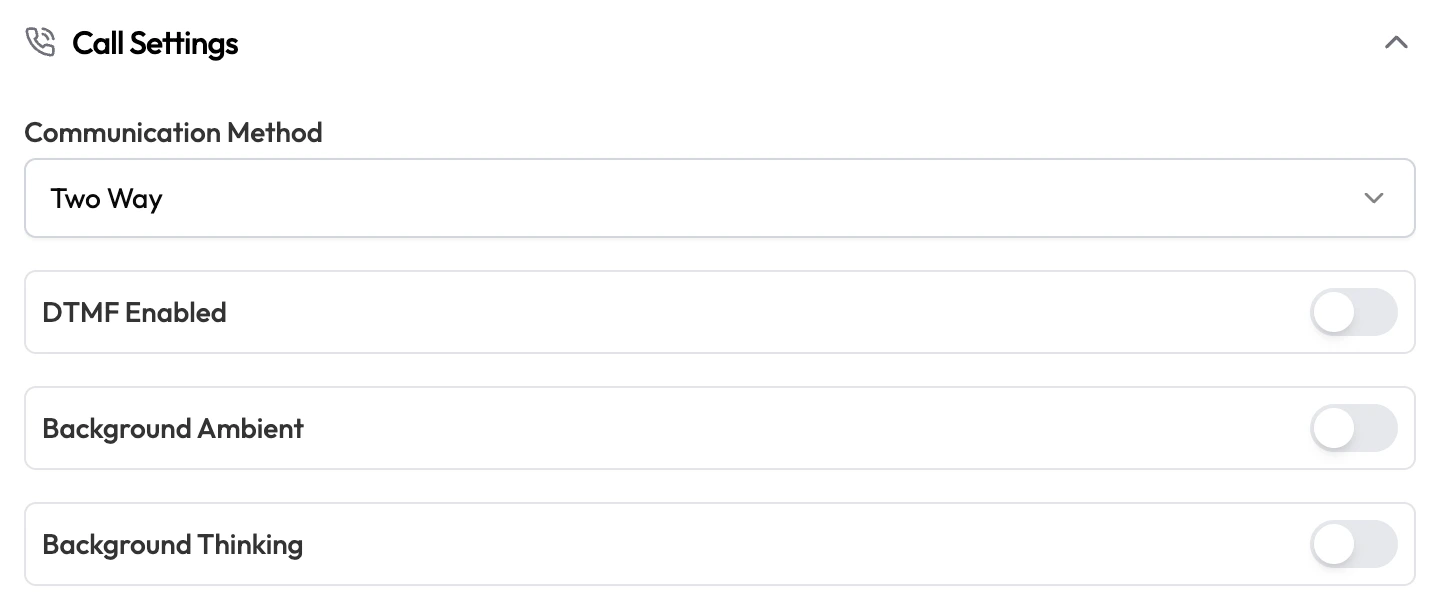 | Background Thinking | Toggle | Off | Play a brief sound while the agent is generating a response, signaling to the caller that something is happening. |