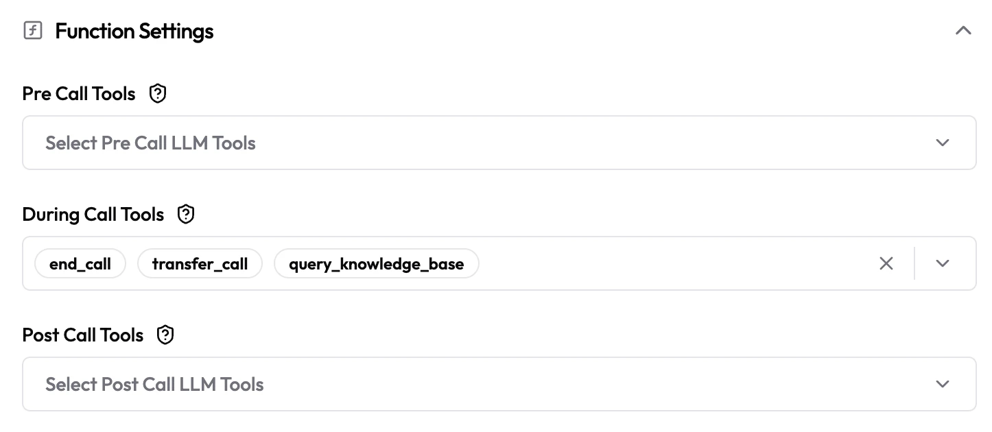 | Pre Call Tools | Multi-select | Empty | LLM tools that run automatically before the call starts (e.g. fetch customer account info). |