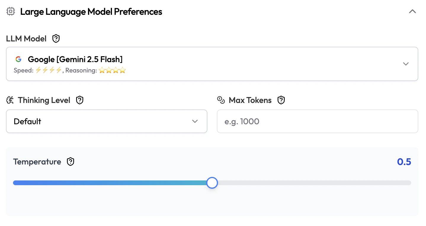 | Temperature | Slider | 0.5 | Response creativity. 0.0 = consistent and precise. 1.0+ = more varied and creative. |