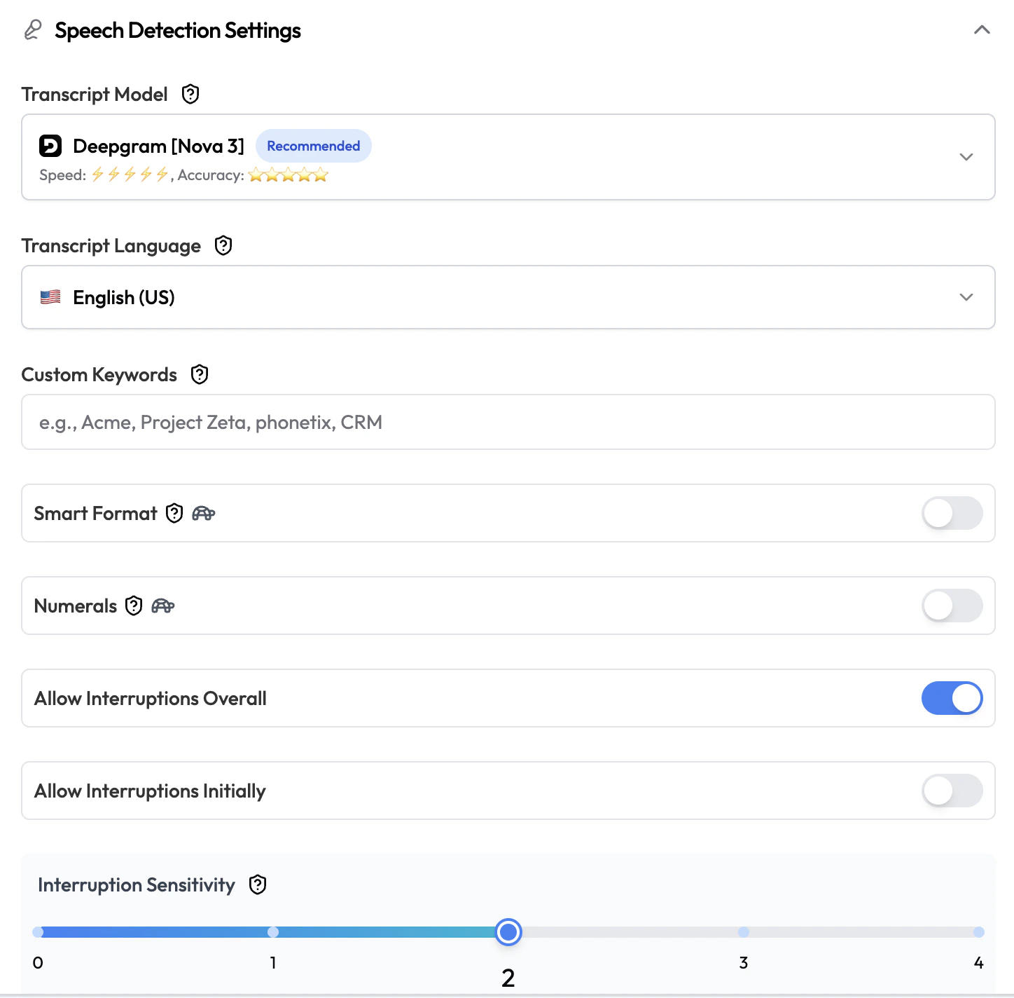 | Smart Format | Toggle | Off | Automatically format numbers, currencies, dates, and addresses in transcripts (e.g. “twenty dollars” → “$20”). |