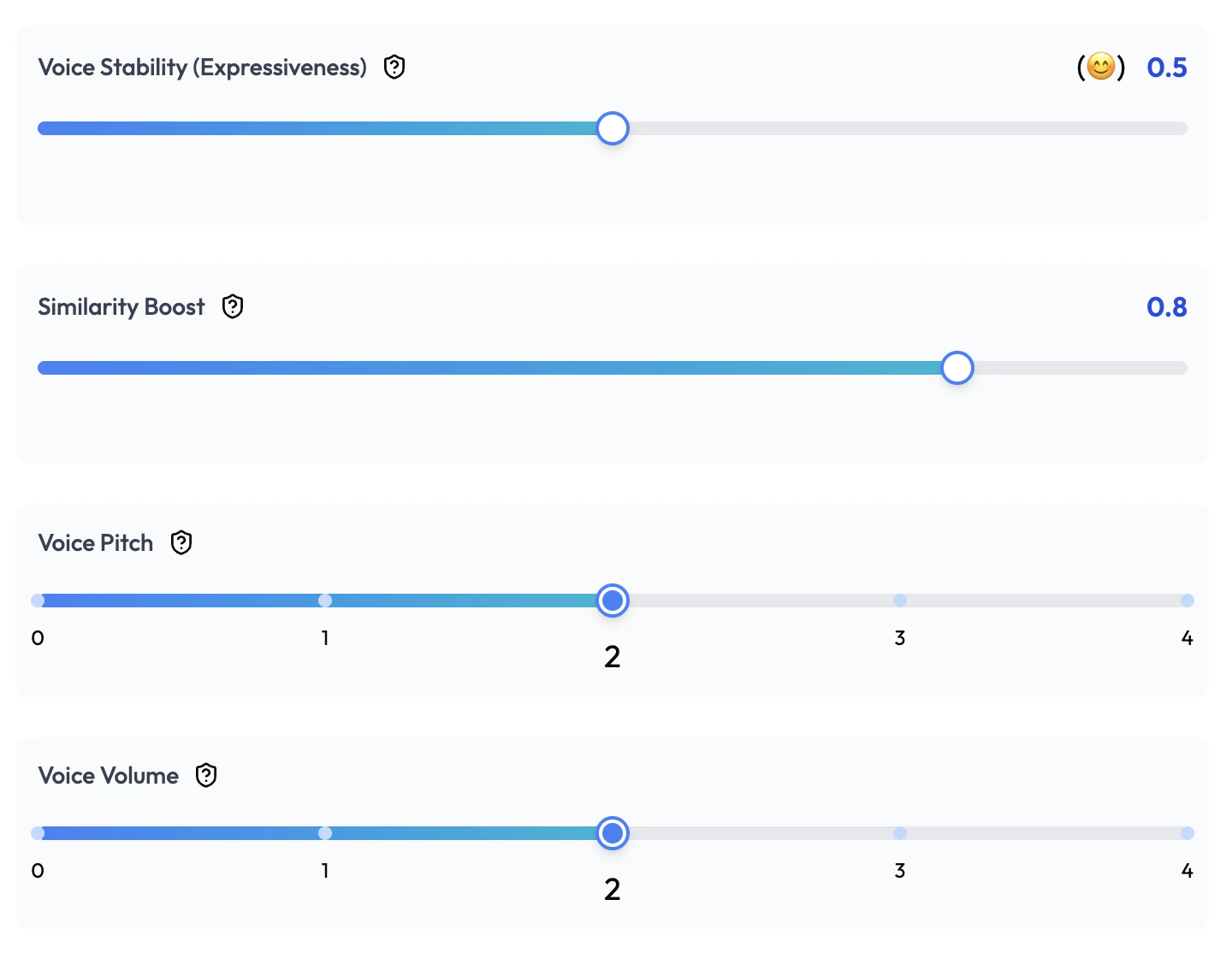 | Voice Stability (Expressiveness) | Slider | 0.5 | How consistent the voice sounds. Lower = more expressive and varied. Higher = very consistent. |