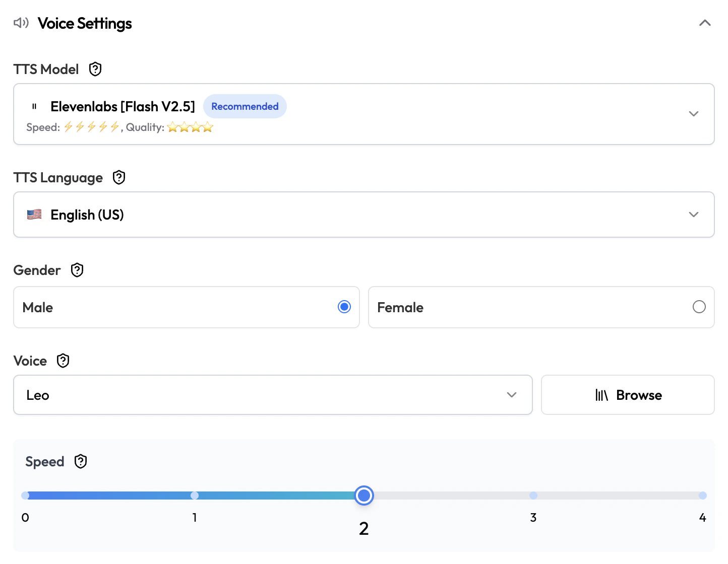 | Speed | Slider | 2 | Speaking speed. Higher = faster. Range: 0–3. |