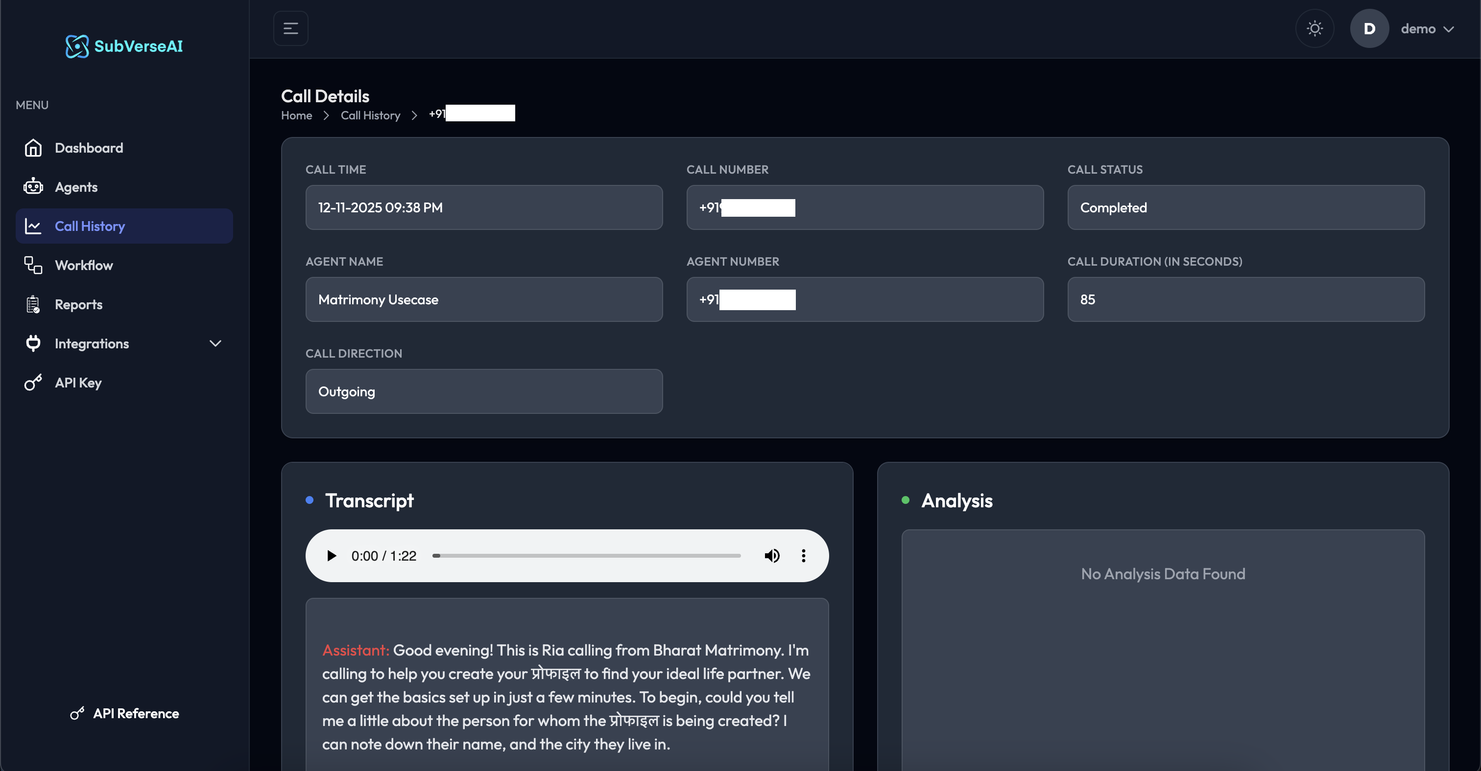 Analysis data may take 1-2 minutes to process after the call ends. If you see “No Analysis Data Found”, check back shortly or ensure Post Call Data Analysis is configured in your agent settings.