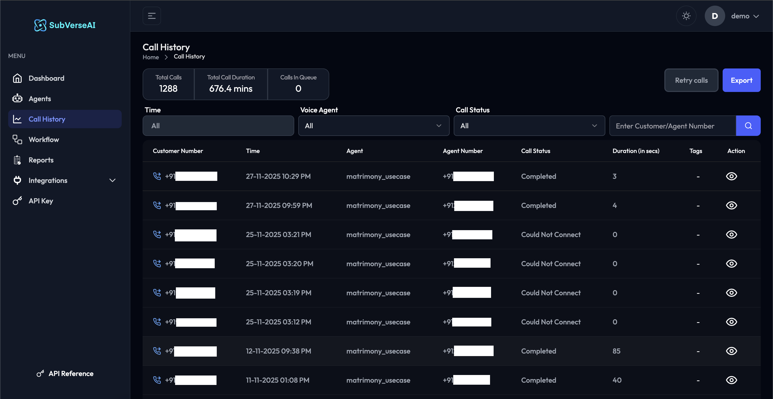 Each call record in the table displays comprehensive information: Customer Number- Phone number of the caller or recipient