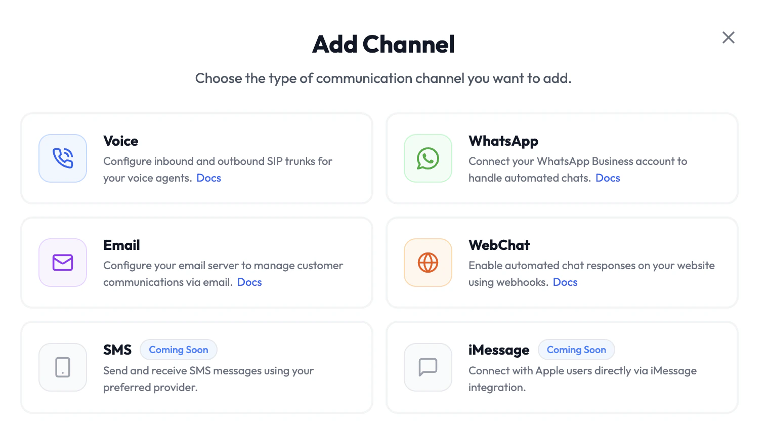 | Voice | SIP Trunk (Inbound / Outbound) | Voice Agent | Phone calls — inbound customer support, outbound dialing |