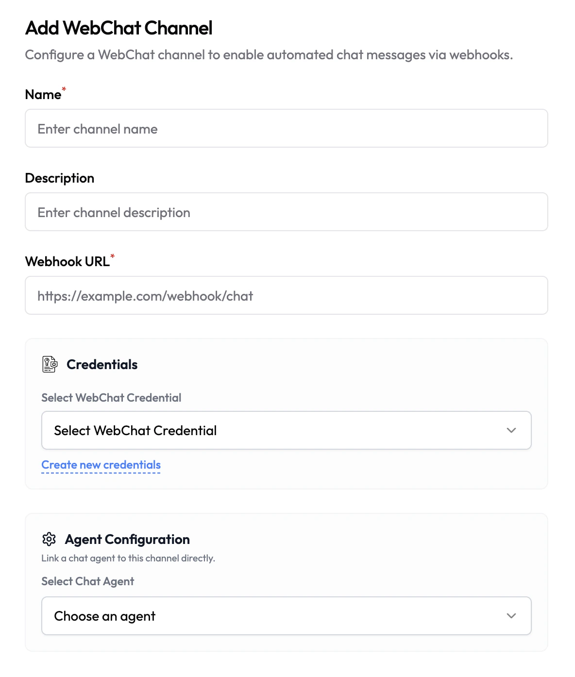 | WebChat Credential | Dropdown | Yes | Select a saved WebChat credential to secure this channel. Click Create new credentials to add one under Credentials. |