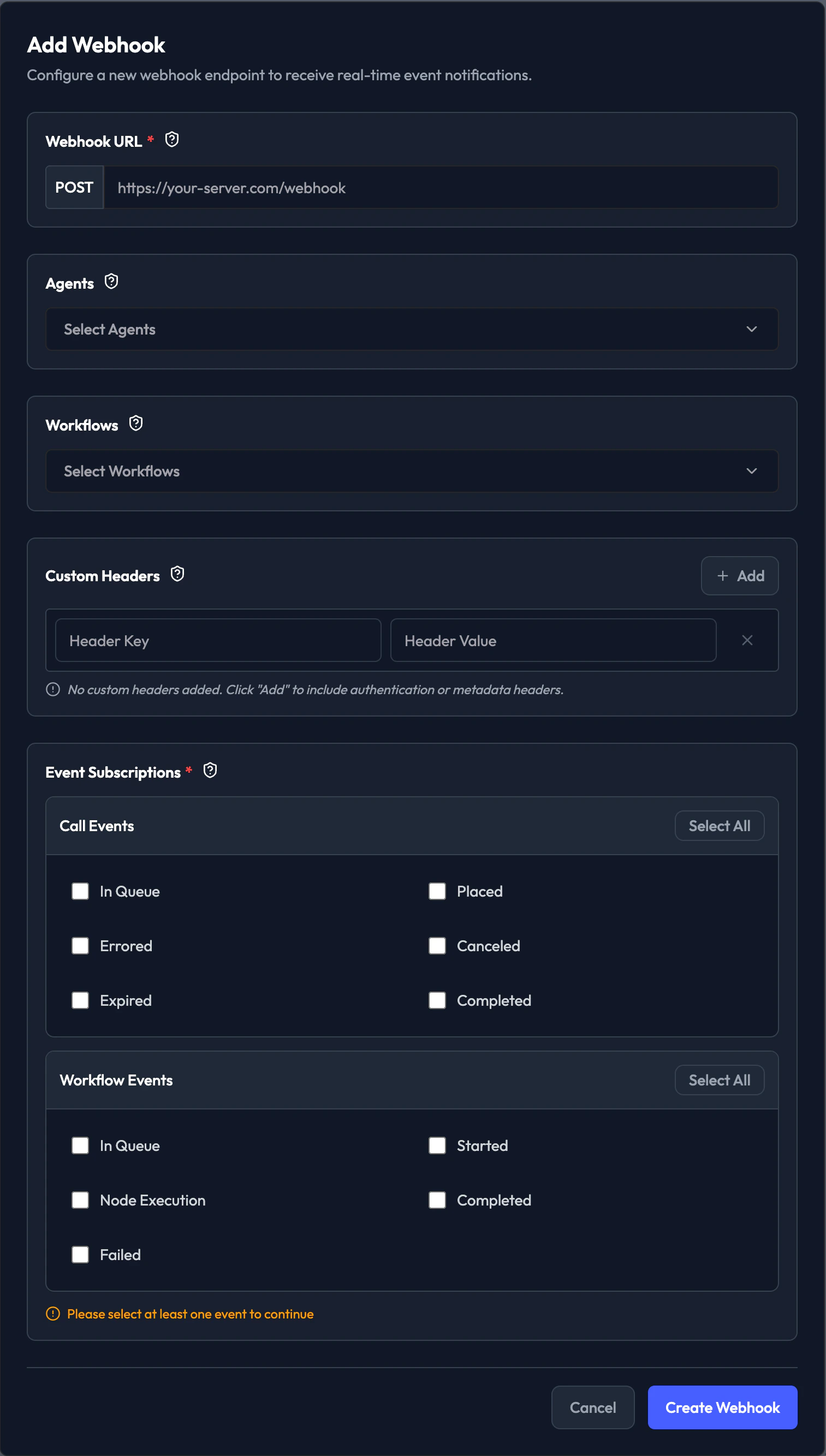 - You must select at least one event to create the webhook
