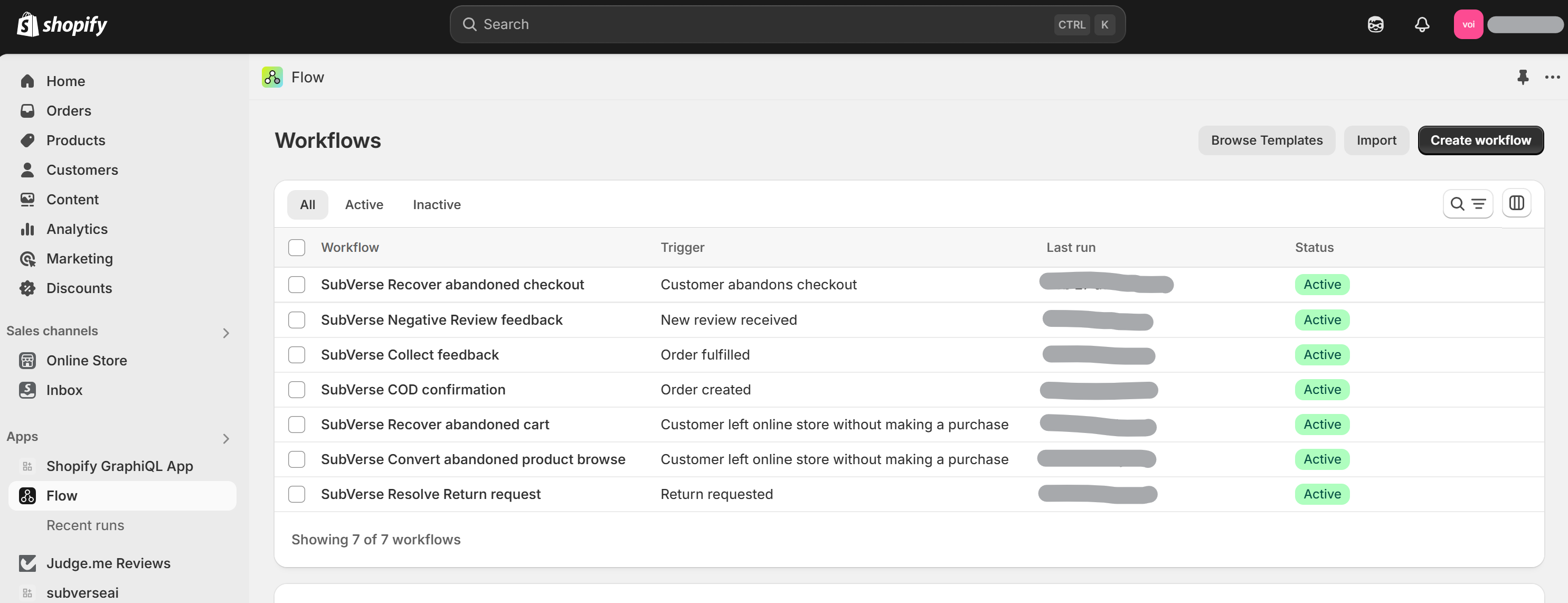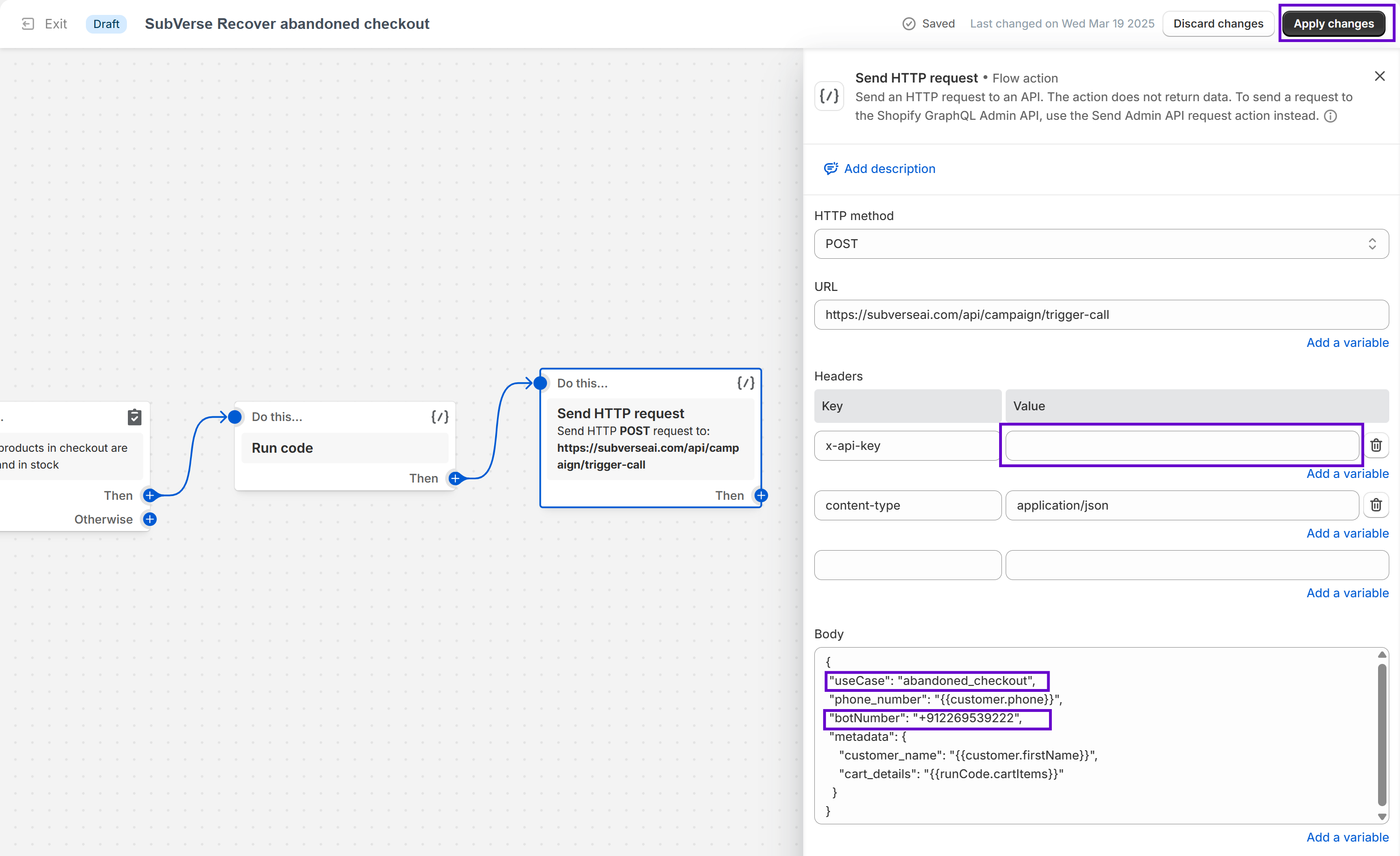 Once you have obtained a phone number, API key, and customized voiec agents on SubVerse interface, you will need to setup workflows to trigger actions based on customer behavior such as cart drop, order placement, reviews.