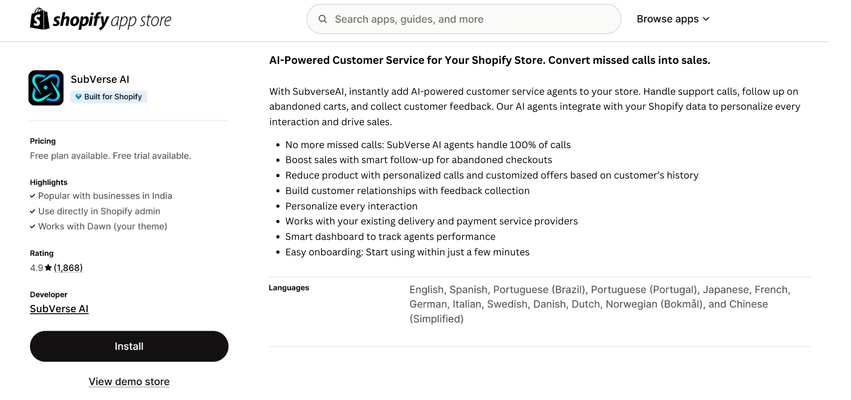 - Install SubVerse plugin by visiting this link or search for SubVerse AI in Shopify app store.