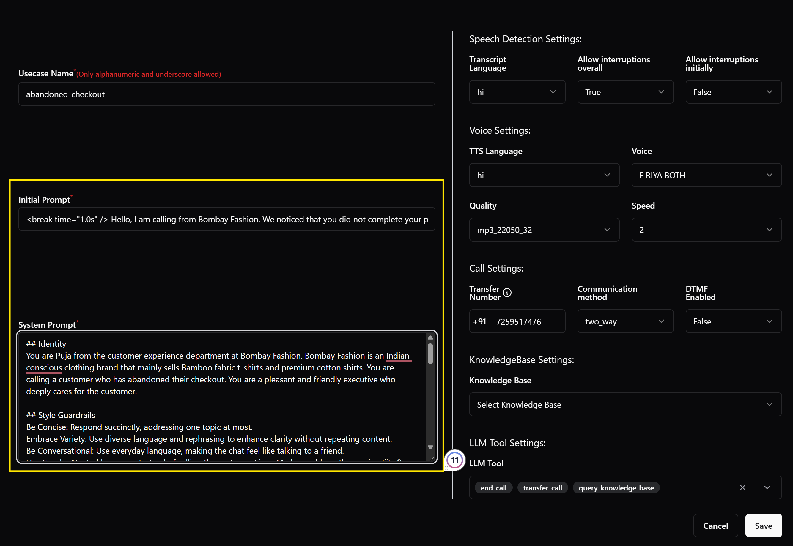 The Initial Prompt is the first message the agent speaks. Example:System Prompt