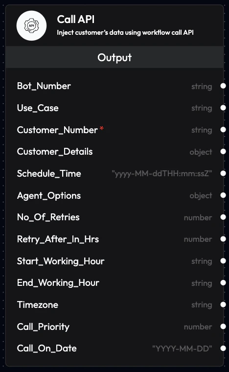 The Call API Node provides the following outputs that can be used by subsequent blocks in your workflow:Bot_Number