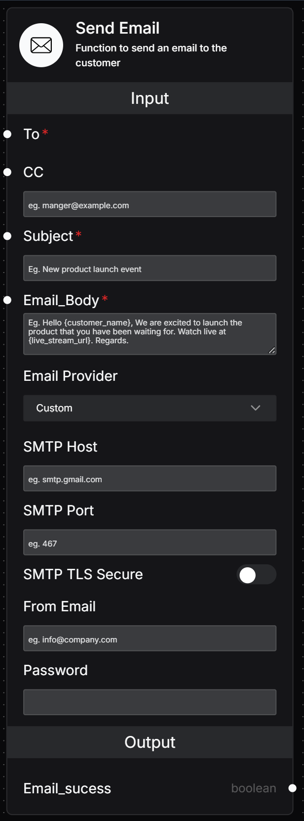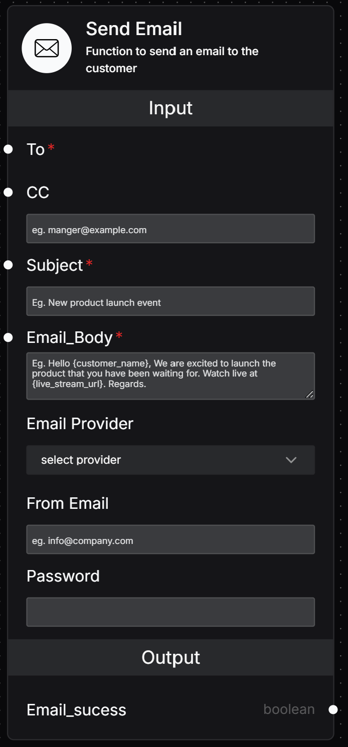 - Email_Body – Content of the email. This can be linked to a connecting block (AI generated email body based on previous conversation) or manually written. Data linkage will override the written text.