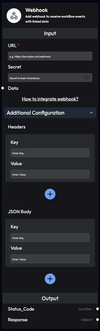 The Webhook Node sends events and data to client-side applications via HTTP POST requests. This enables your workflows to integrate with external systems, CRMs, databases, and custom applications.